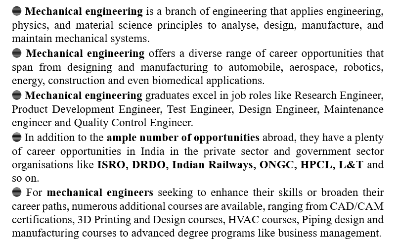 - Mechanical Design – Capable to Design Mechanical Systems with updated software tools and equipment’s/Processes to meet desired Specifications and requirements within realistic constraints to solve real time mechanical/societal problems.